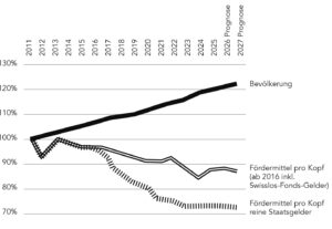 Neu finden Sie auf dieser Seite auch eine grafische Darstellung, wie sich die Fördermittel «pro Kopf» gemessen an der Bevölkerungszahl entwickeln. Seit Jahren ist ein sinkender Trend festzustellen, weil einerseits die nominalen Beiträge des Kantons an das Aargauer Kuratorium stagnieren, andererseits die Bevölkerung stetig wächst. Gemessen an der Bevölkerungszahl fällt der Aargau bei der Kulturförderung im Vergleich zu den anderen Kantonen deutlich zurück.